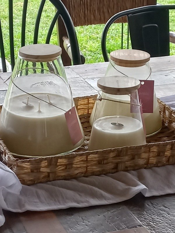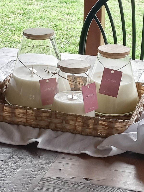Vela de cera de soja en Vaso de vidrio con tapa de madera.